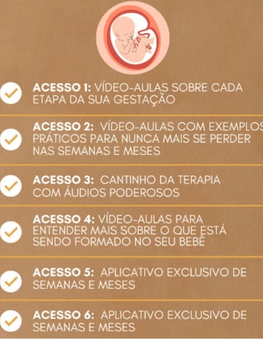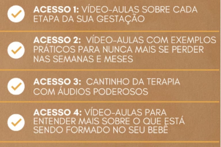 Você terá acesso por 12 meses, podendo assistir às aulas e utilizar todos os bônus durante toda a gestação (e até depois, se quiser rever).